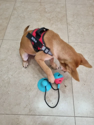 Dobrze, że dog jest bardziej zainteresowany elementem przyssawki i liną niż piłką.